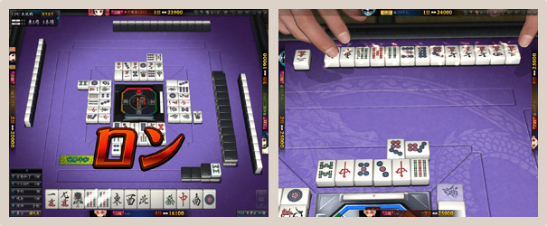 他人が河に捨て牌を行った際に、それが自分にとっての和了牌で有った場合【ロン】と発声した上で、手牌を公開します。